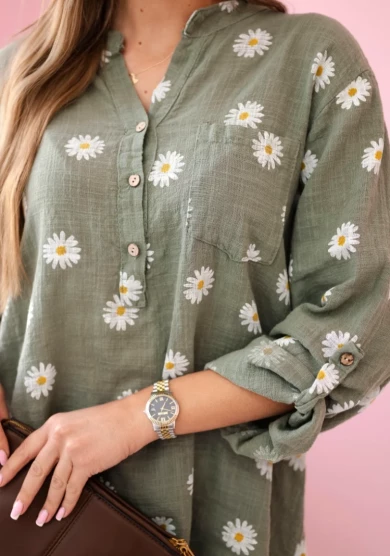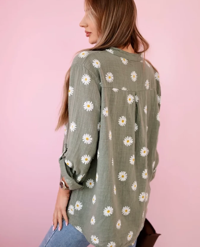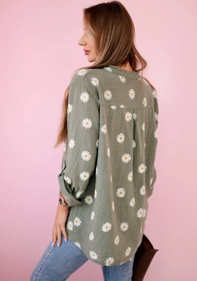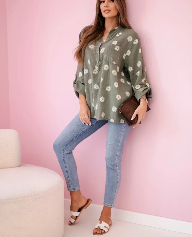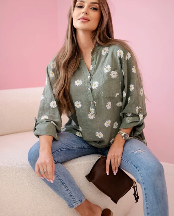 Bawełniana damska bluzka w kwiaty z długim rękawem i guzikami Khaki