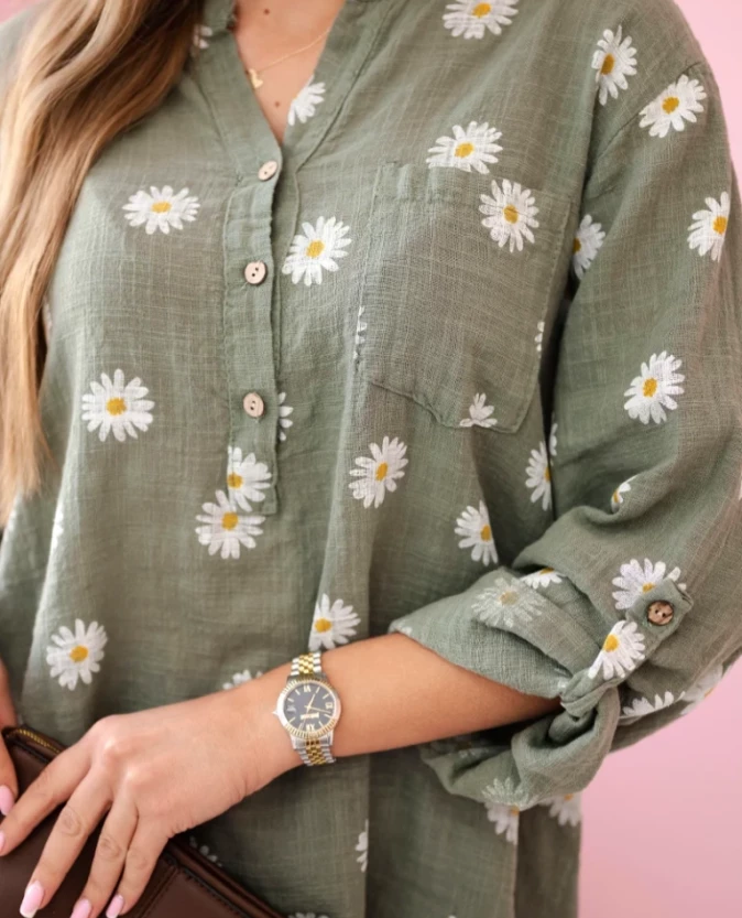 Odcień khaki w połączeniu z subtelnym printem w stokrotki tworzy stylową, naturalną kompozycję. To doskonała propozycja dla kobiet ceniących modne, ale stonowane kolory.