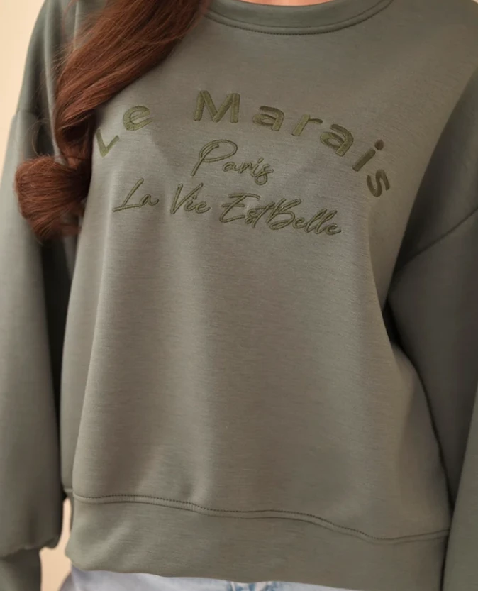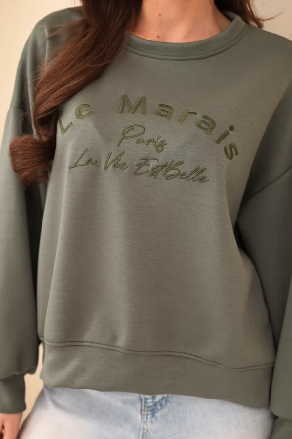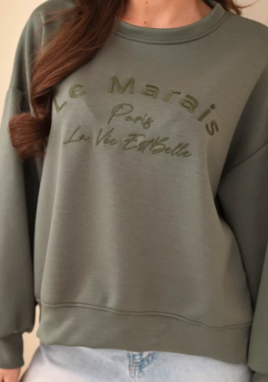 Bluza damska z haftem "Le Marais Paris La Vie Est Belle" - Khaki