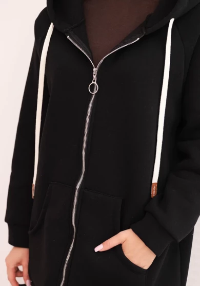 Czarna bluza ocieplana z kapturem to klasyczna i praktyczna propozycja na chłodne dni. Miękka, grubsza dzianina gwarantuje komfort i ciepło, a dłuższy fason zapewnia wygodę oraz lepszą ochronę przed zimnem. Model wyposażony jest w suwak na całej długości, duży kaptur z szerokimi sznurkami oraz funkcjonalne kieszenie z przodu.