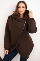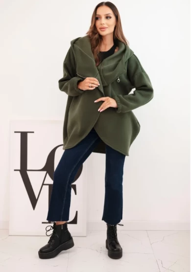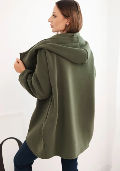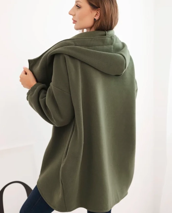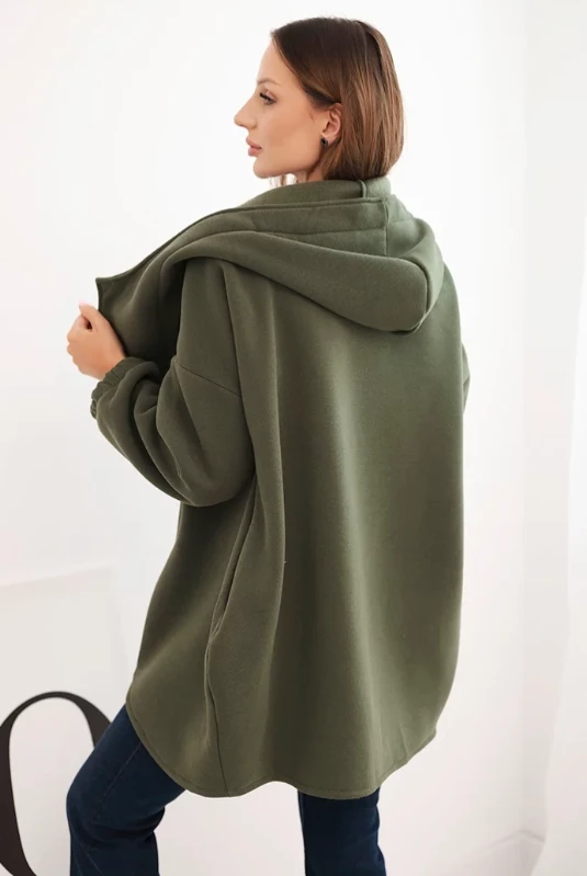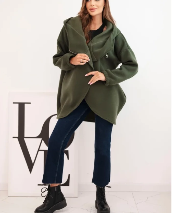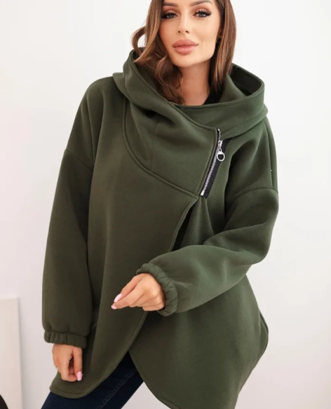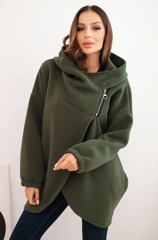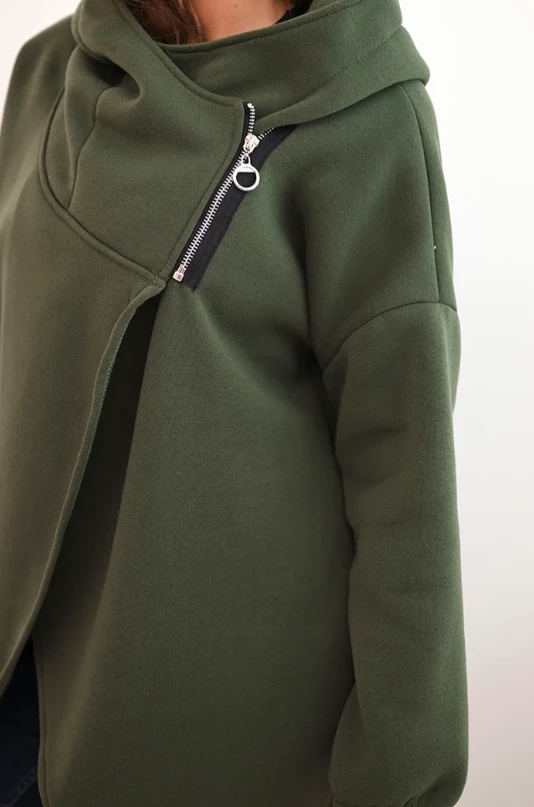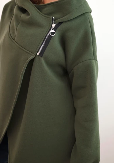 Bluza damska ocieplana z kapturem i asymetrycznym zamkiem Khaki