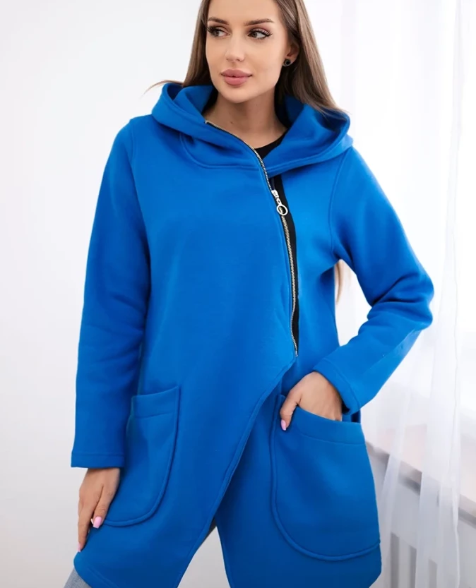Chabrowa bluza z asymetrycznym suwakiem i praktycznym kapturem łączy komfort z nowoczesnym, casualowym stylem. Dłuższy przód oraz dwie naszyte kieszenie dodają bluzie funkcjonalności i lekkości, a ocieplany materiał zapewnia ciepło i wygodę przez cały dzień.