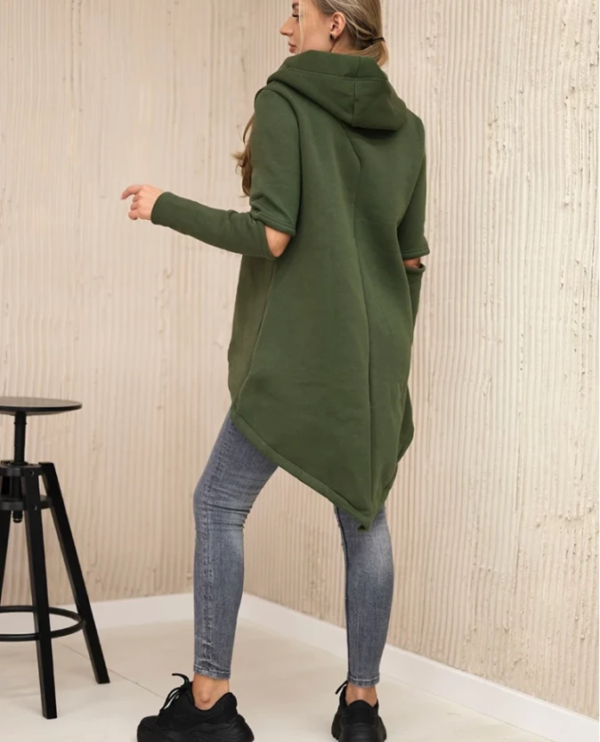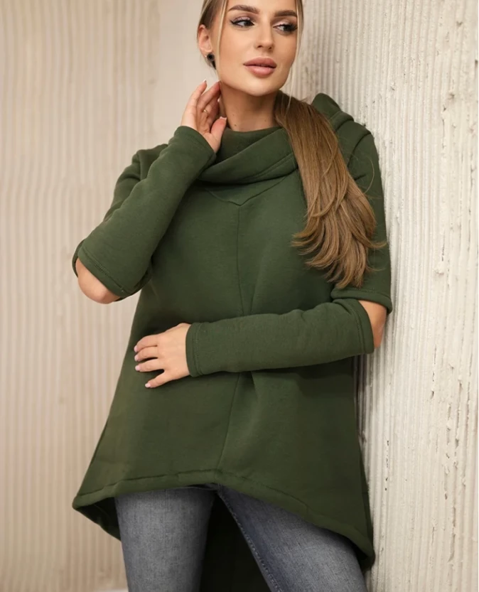 Khaki bluza z dłuższym tyłem i praktycznym kapturem łączy komfort noszenia z nowoczesnym, subtelnym designem. Rozcięte rękawy na łokciach dodają lekkości, a ocieplany materiał utrzymuje ciepło i wygodę przez cały dzień. Uniwersalny rozmiar dopasowuje się do S, M i L – idealna do codziennych, stylowych zestawów.