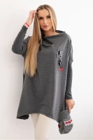 Bardzo wygodna bluza, posiada dłuższe boki. Przy szyi ma ozdobną taśmę. Rękawy z prążkowanego materiału. Bluza wykonana jest z wysokiej jakości materiału. Rozmiar jest uniwersalny i będzie odpowiedni dla Pań noszących rozmiar M, L lub XL.