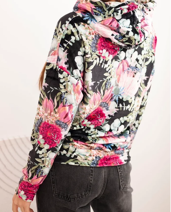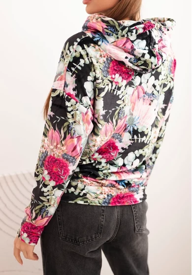 Welurowa bluza z kapturem w kwiaty – czarna