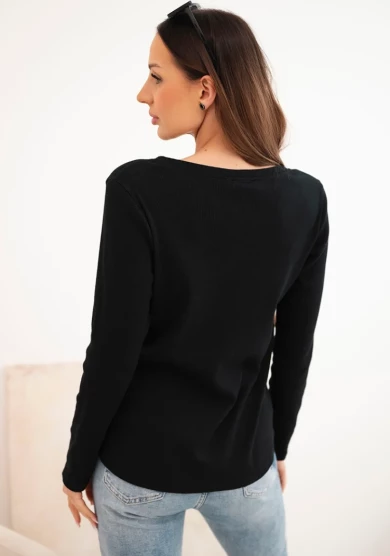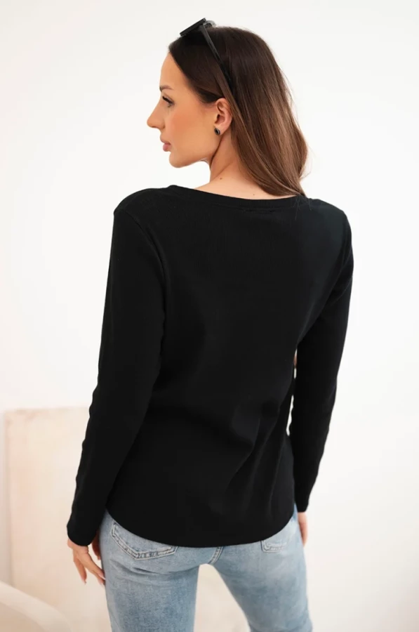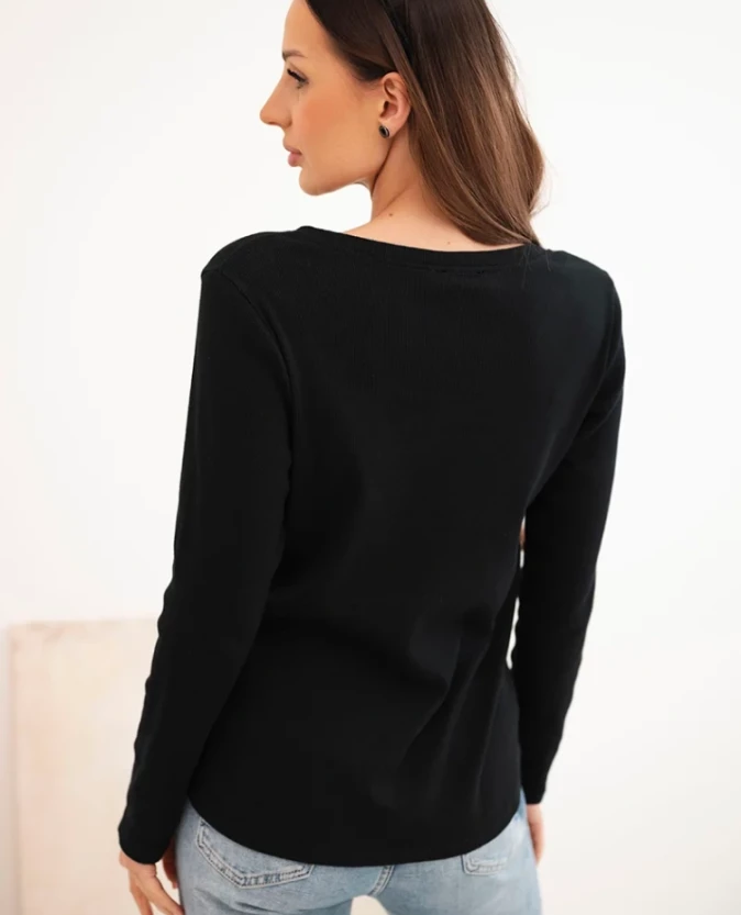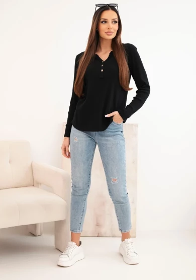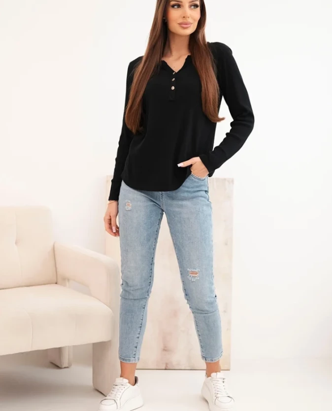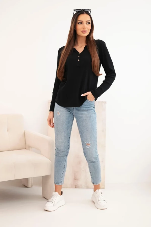 Bluzka damska z długim rękawem i dekoltem na guziki - Czarna