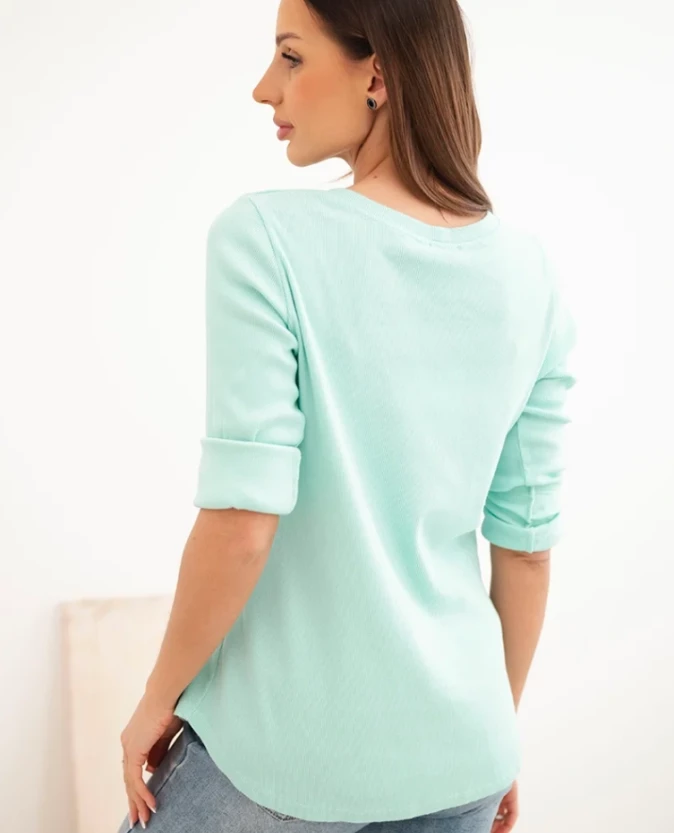Miętowa bluzka damska z długim rękawem i ozdobnymi guzikami przy dekolcie to połączenie świeżości i elegancji w codziennym wydaniu. Elastyczny, prążkowany materiał z bawełny gwarantuje wygodę i komfort noszenia.