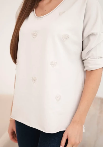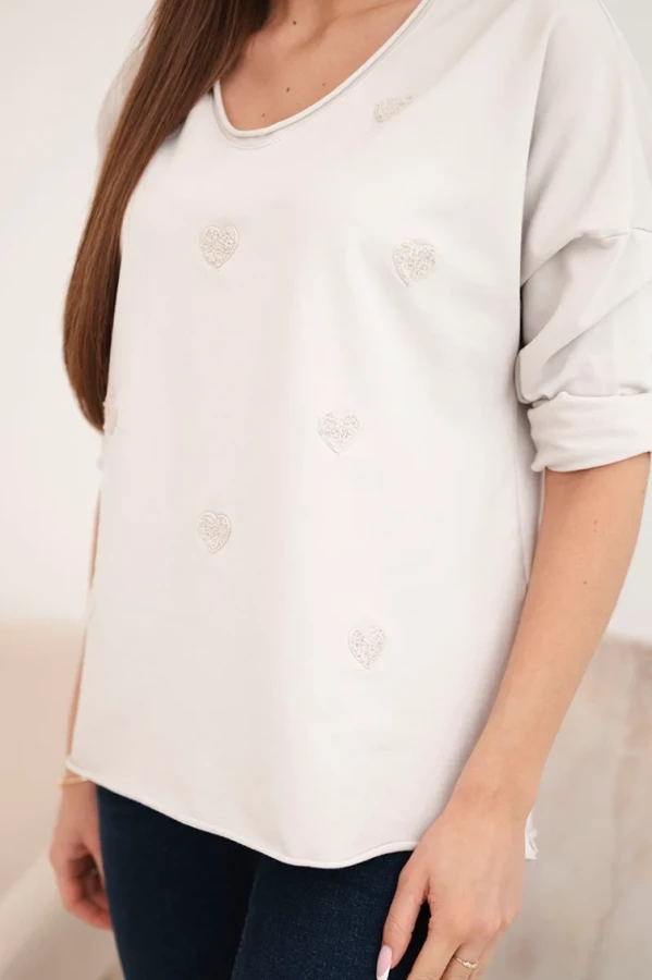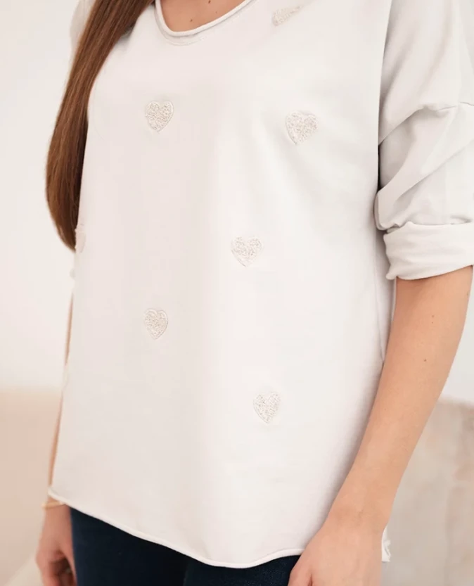Bluzka damska bawełniana z długim rękawem i serduszkami Beżowy