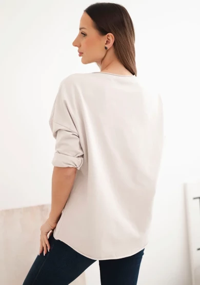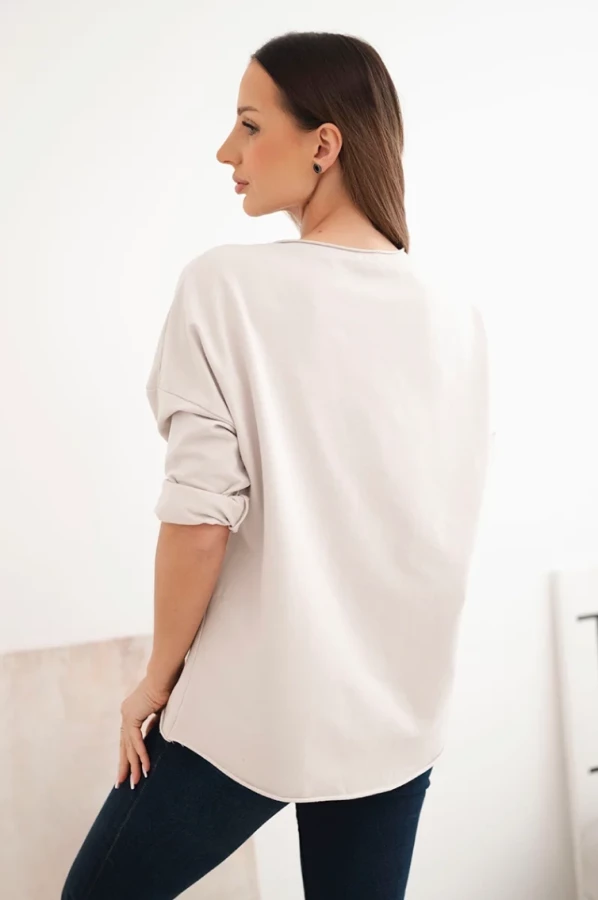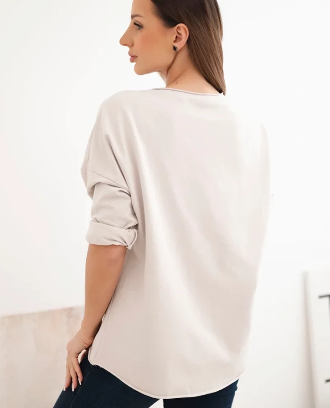 Dekolt w kształcie litery V delikatnie podkreśla szyję, a beżowy kolor nadaje stylizacji klasy i uniwersalności. Haftowane serduszka dodają całości uroku i sprawiają, że model wyróżnia się na tle klasycznych bluzek. Idealna do codziennych stylizacji z jeansami, legginsami lub spódnicą.