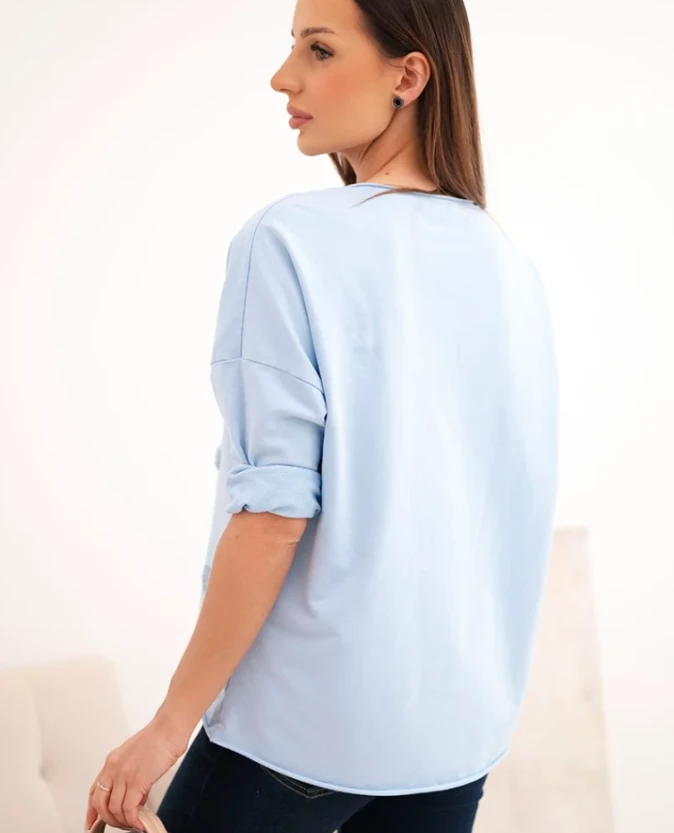 Luźniejszy fason nie krępuje ruchów, a dekolt w serek pięknie podkreśla szyję i wysmukla górną część sylwetki. Niebieski kolor w połączeniu z romantycznym wzorem nadaje stylizacji lekkości i świeżości. Doskonale komponuje się z jeansami, legginsami oraz spódnicą, pozwalając stworzyć zarówno casualowe, jak i bardziej kobiece zestawy.