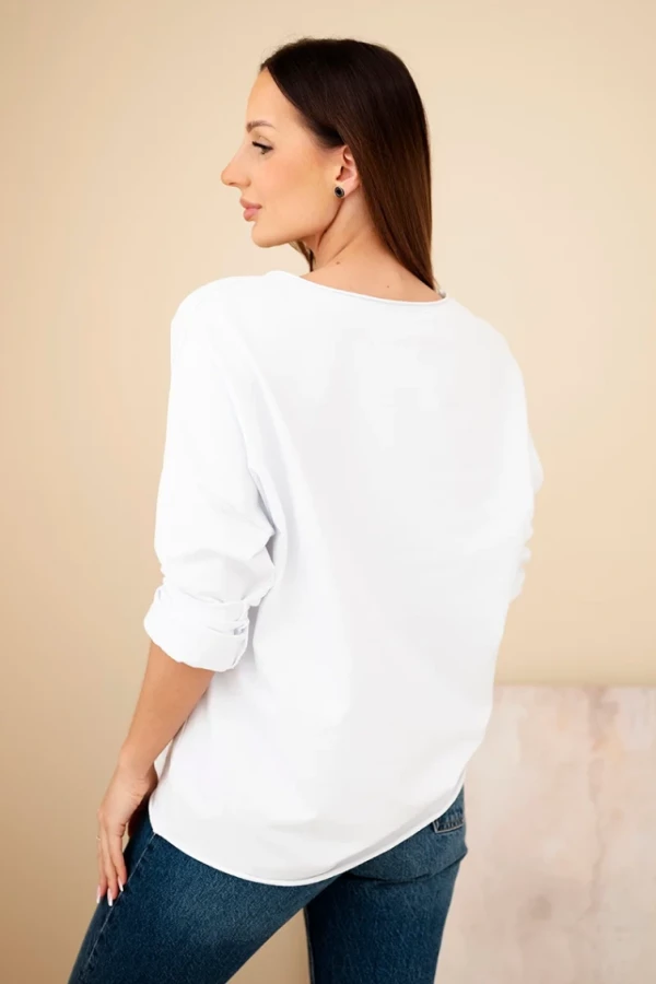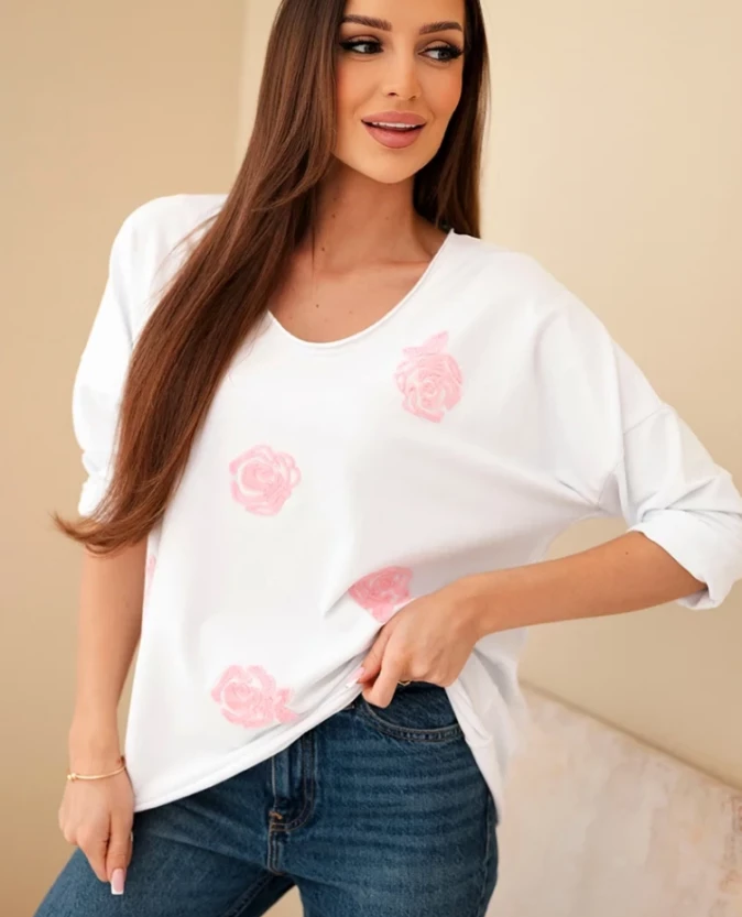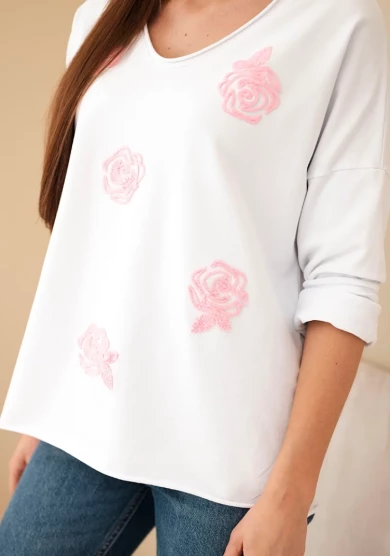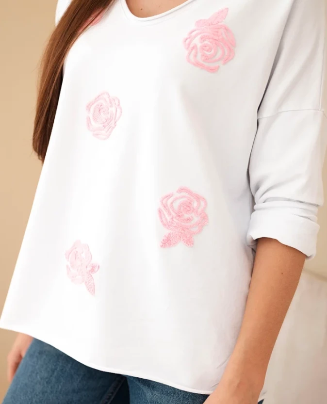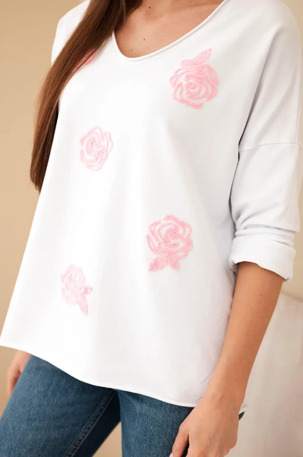 Bluzka z haftowanymi kwiatami - Biały + Różowy