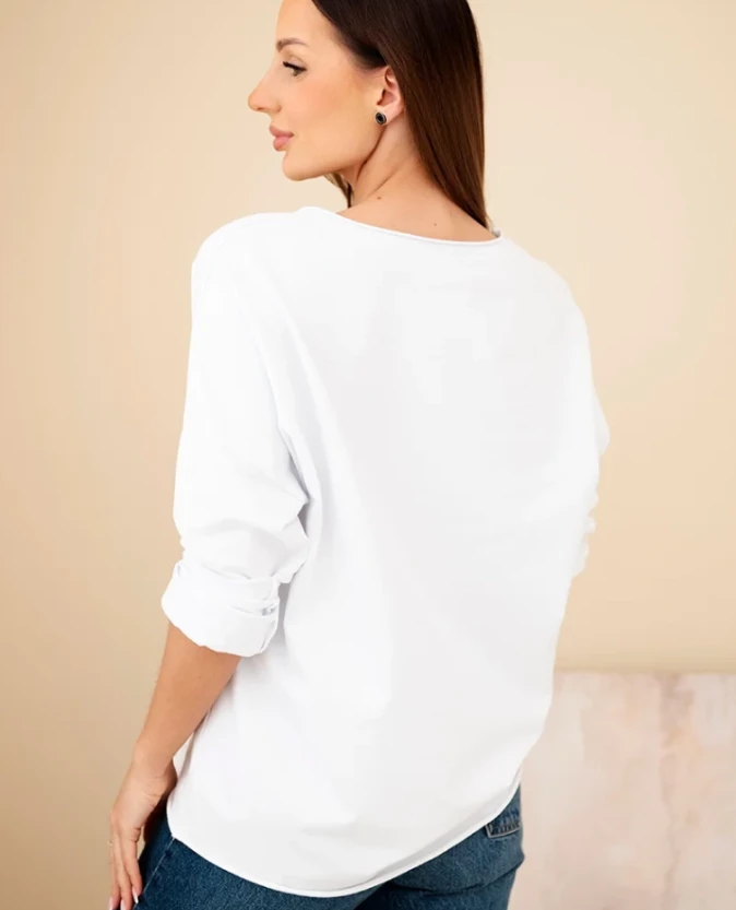 Miękka, elastyczna bawełna zapewnia komfort noszenia i doskonałe dopasowanie. Luźniejszy krój sprawia, że bluzka świetnie wygląda zarówno z jeansami, jak i ze spódnicą.