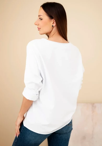 Bluzka w połączeniu bieli z różowymi haftowanymi kwiatami to świeża i kobieca propozycja na co dzień. Dekolt w serek subtelnie podkreśla szyję, a kwiatowe zdobienia przyciągają wzrok i nadają stylizacji romantycznego charakteru.