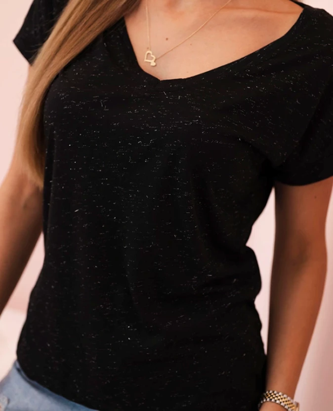 Bluzka damska bluzka bawełniana z dekoltem V i krótkim rękawem Czarna