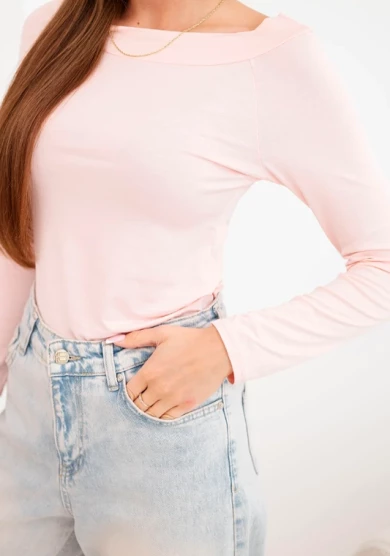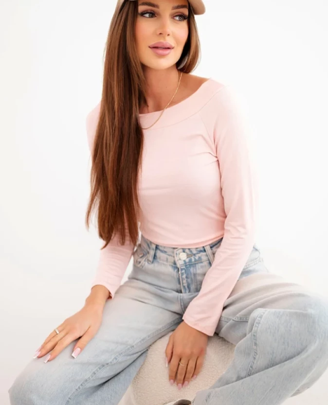 Bluzka damska wiskozowa z szerokim dekoltem i długim rękawem Róż Pudrowy