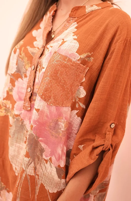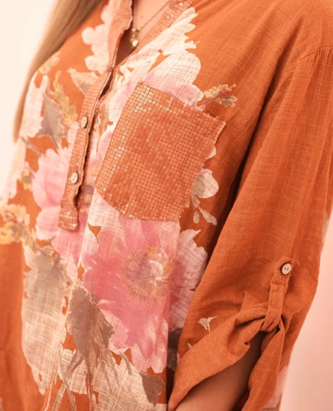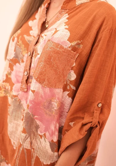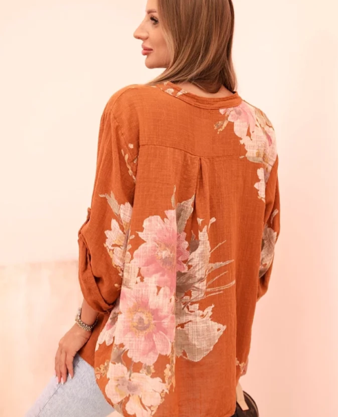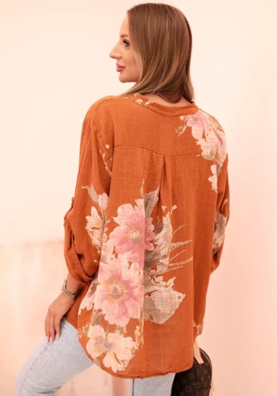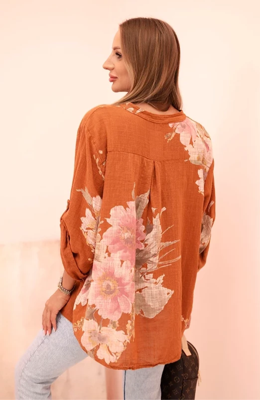 Bluzka damska z bawełny z kwiatowym wzorem i guzikami Ruda