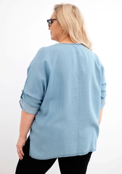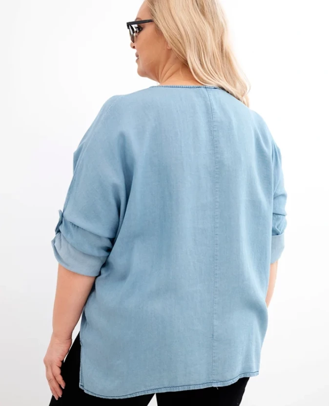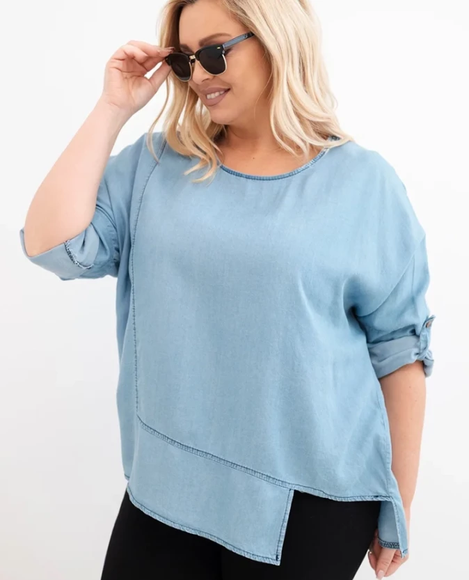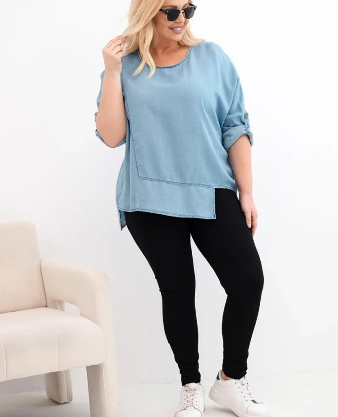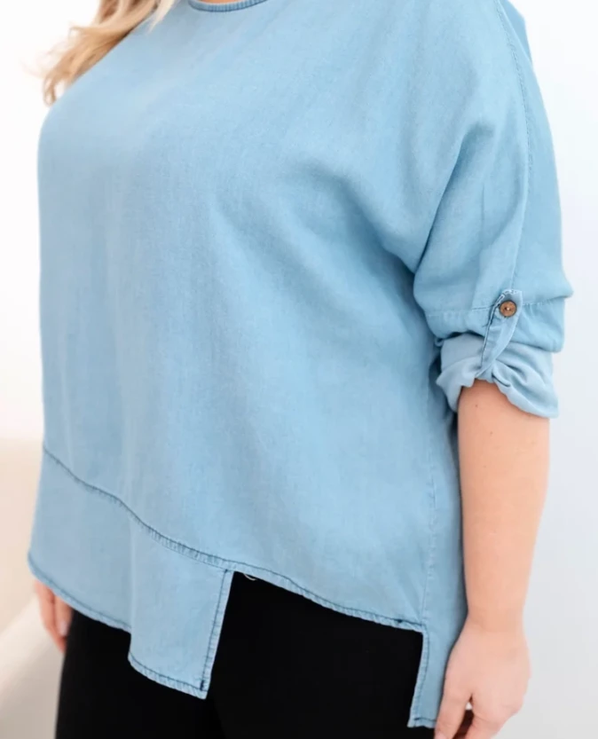 Casualowa bluzka damska z lyocellu w jasno jeansowym odcieniu to połączenie komfortu i modnego designu. Luźny fason oversize z asymetrycznym dołem gwarantuje swobodę ruchów i lekko maskuje niedoskonałości sylwetki.