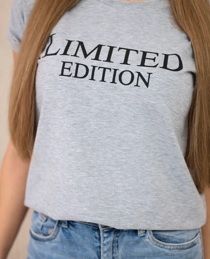 Wygodna bluzka damska z nadrukiem „Limited Edition” w klasycznym szarym kolorze to doskonała baza wielu codziennych stylizacji. Neutralny odcień sprawia, że bluzka jest niezwykle uniwersalna i łatwa do zestawienia z różnymi elementami garderoby.