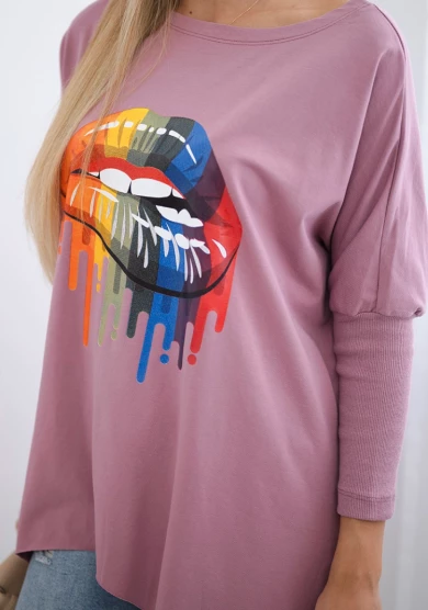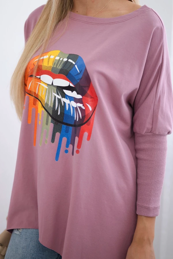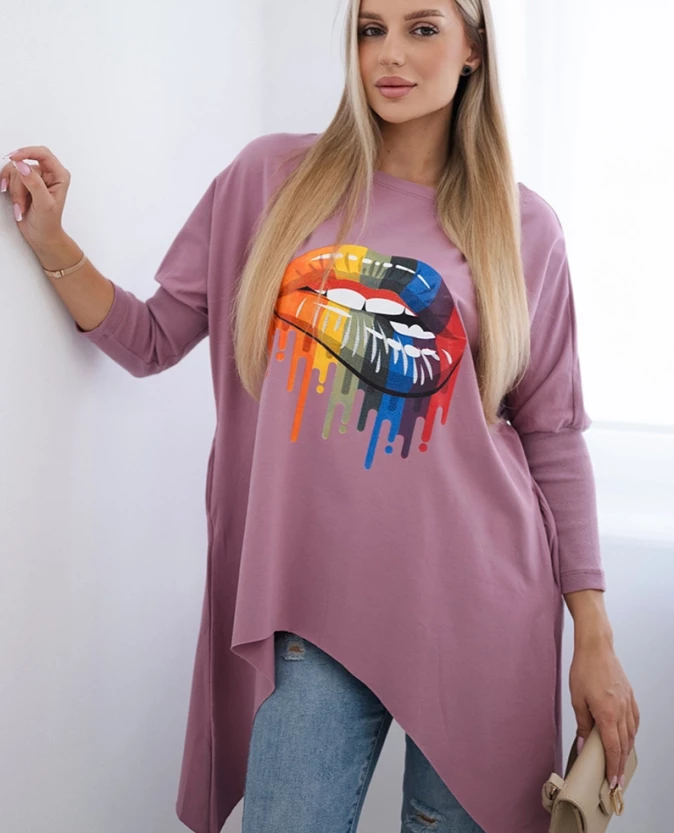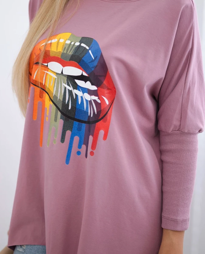 Bluzka oversize z nadrukiem tęczowych ust Ciemny Różowy