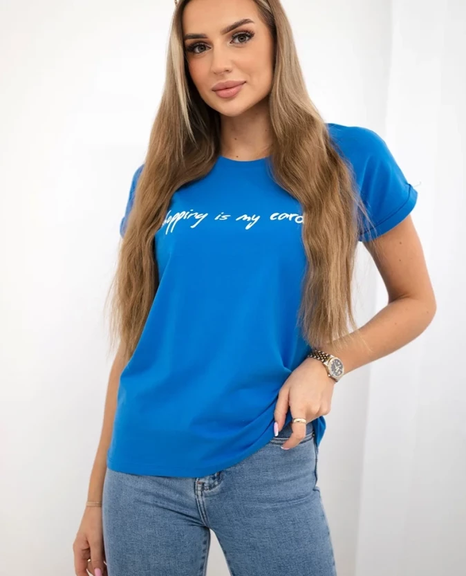 Modna bluzka damska z napisem „Shopping is my cardio” w pięknym chabrowym kolorze to doskonała propozycja dla kobiet, które lubią wyraziste i stylowe elementy garderoby. Intensywny odcień niebieskiego dodaje stylizacji świeżości i nowoczesnego charakteru.