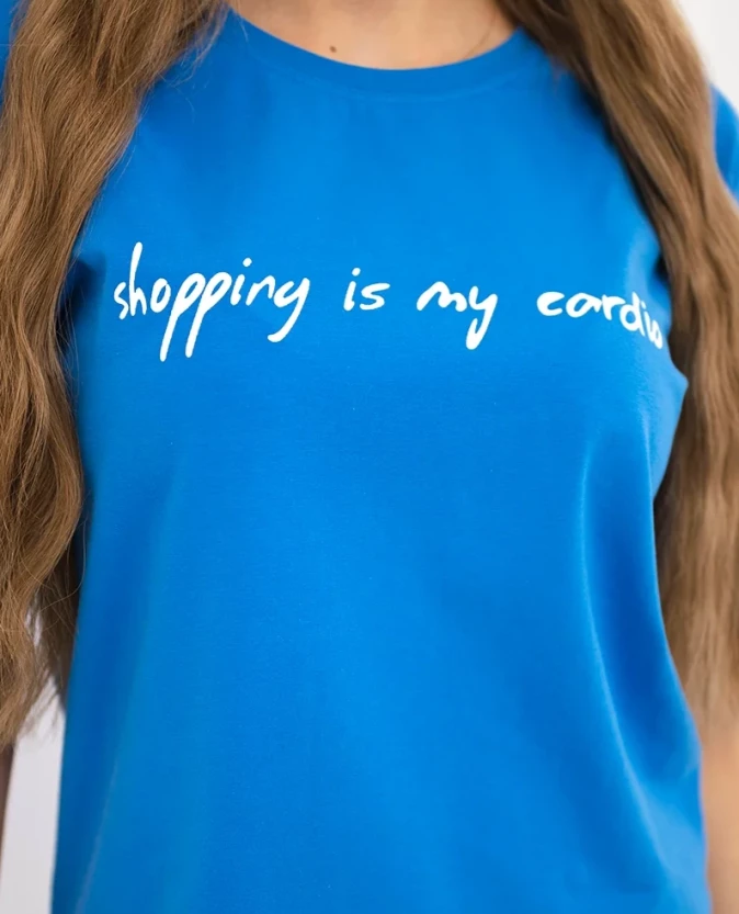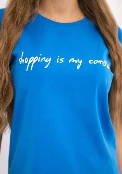 Bluzka damska z nadrukiem „Shopping is my cardio” – chabrowa