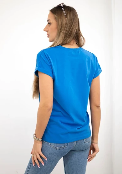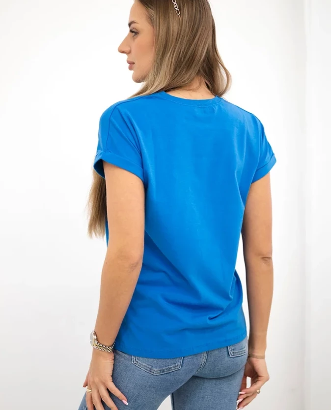 Bluzka posiada krótki rękaw i komfortowy krój, dzięki czemu świetnie sprawdzi się podczas cieplejszych dni. Miękki materiał zapewnia wygodę noszenia, a uniwersalny fason pozwala łatwo dopasować ją do wielu stylizacji – od casualowych po bardziej modowe.