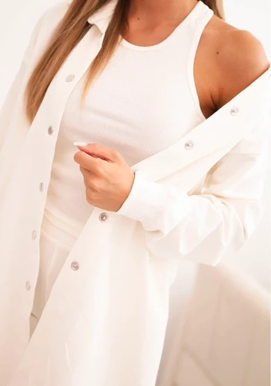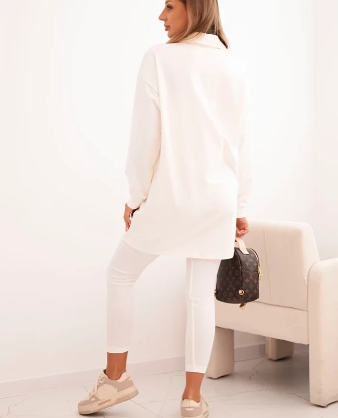 Komplet w kolorze ecru łączy ponadczasową elegancję z funkcjonalnością. Bluza na napy o swobodnym kroju zapewnia komfort i nowoczesny wygląd, elastyczny top dopasowuje się do sylwetki, a prążkowane legginsy podkreślają kobiece proporcje. Jasny, subtelny odcień nadaje stylizacji świeżości i klasy.