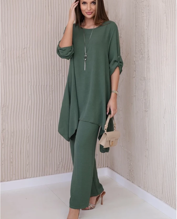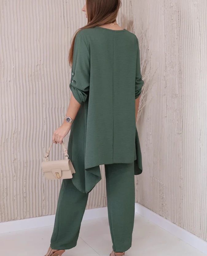 Ciemniejsza wersja khaki to propozycja dla kobiet, które lubią stonowane, eleganckie barwy. Zestaw łączy wygodę z wyrafinowanym stylem, sprawdzając się w wielu sytuacjach – od pracy po spotkania towarzyskie.