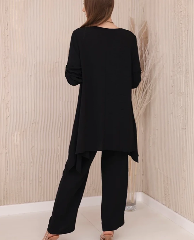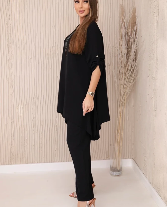 Czarny komplet to synonim klasy i uniwersalnej elegancji. Rozkloszowana bluzka pięknie układa się w ruchu, a spodnie o klasycznym kroju zapewniają wygodę i stylowy wygląd. To doskonała propozycja zarówno do pracy, jak i na wyjątkowe okazje.