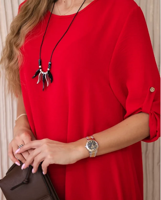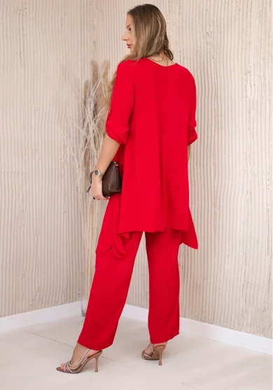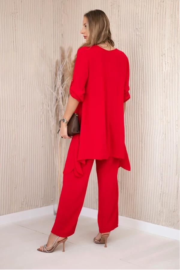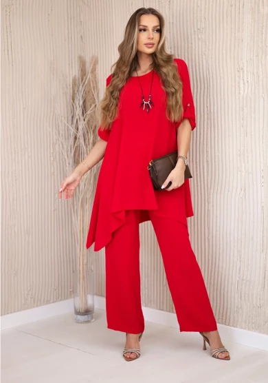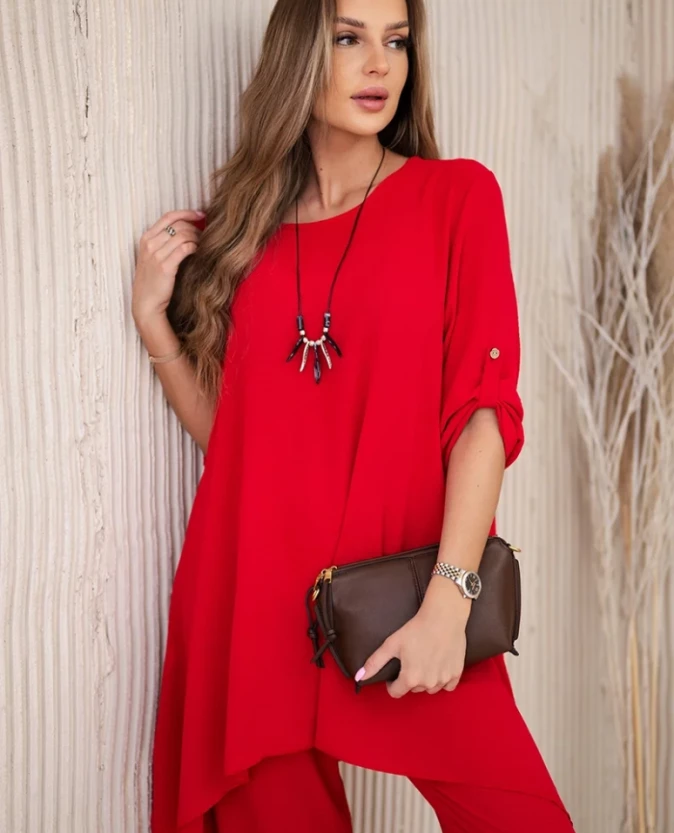 Wyrazisty czerwony komplet to propozycja dla pewnych siebie kobiet. Przyciąga uwagę i podkreśla charakter stylizacji. Doskonały na wyjątkowe okazje, kolacje czy ważne spotkania.