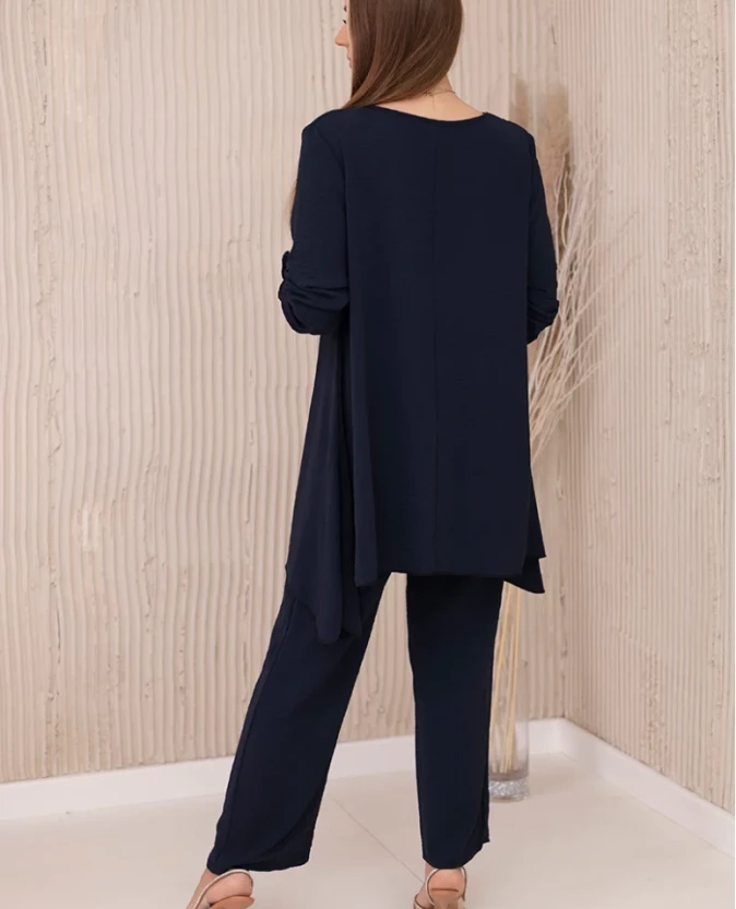 Elegancki komplet włoski w klasycznym granacie to ponadczasowa propozycja dla kobiet ceniących styl i wygodę. Rozkloszowana bluzka subtelnie podkreśla sylwetkę i nadaje lekkości całej stylizacji, a klasyczne spodnie tworzą spójną, elegancką całość. Idealny wybór na spotkania biznesowe, uroczystości rodzinne czy wieczorne wyjścia.