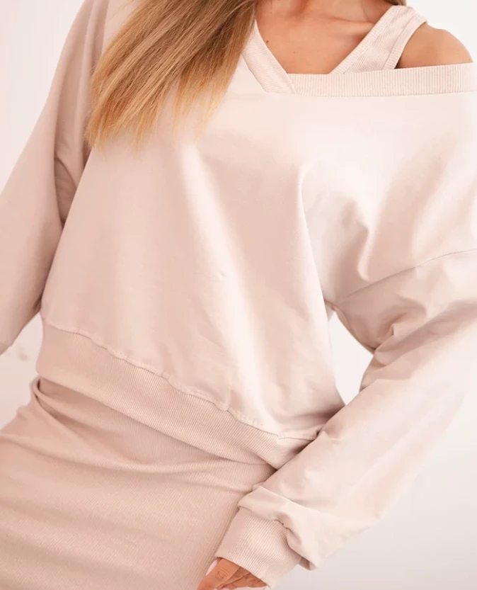 Beżowy komplet bluzki i prążkowanej sukienki – klasyka i delikatny szyk