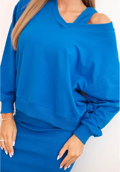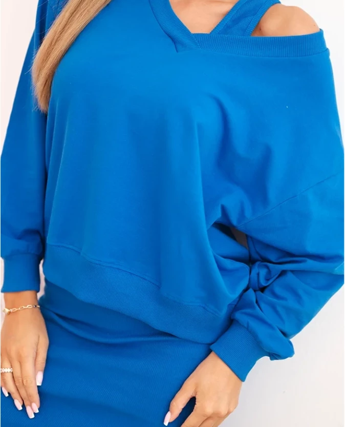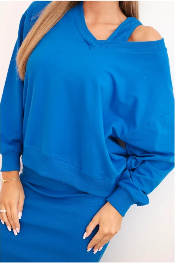 Chabrowy komplet łączy modny kolor z kobiecym krojem. Sukienka o prążkowanej strukturze podkreśla figurę, a bluzka umożliwia tworzenie zarówno eleganckich, jak i codziennych stylizacji. Wysoka jakość materiału gwarantuje wygodę i trwałość na wiele sezonów.