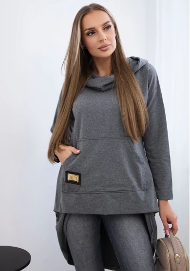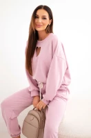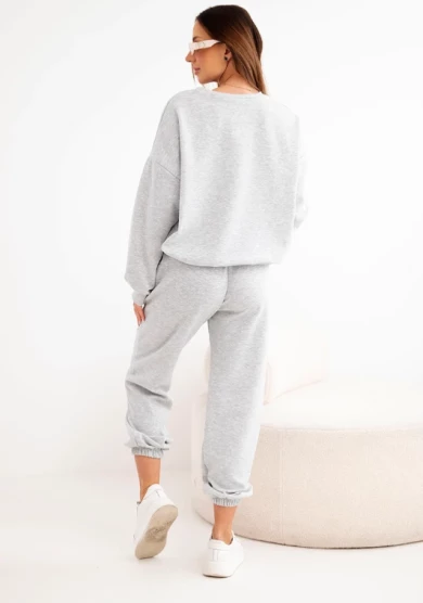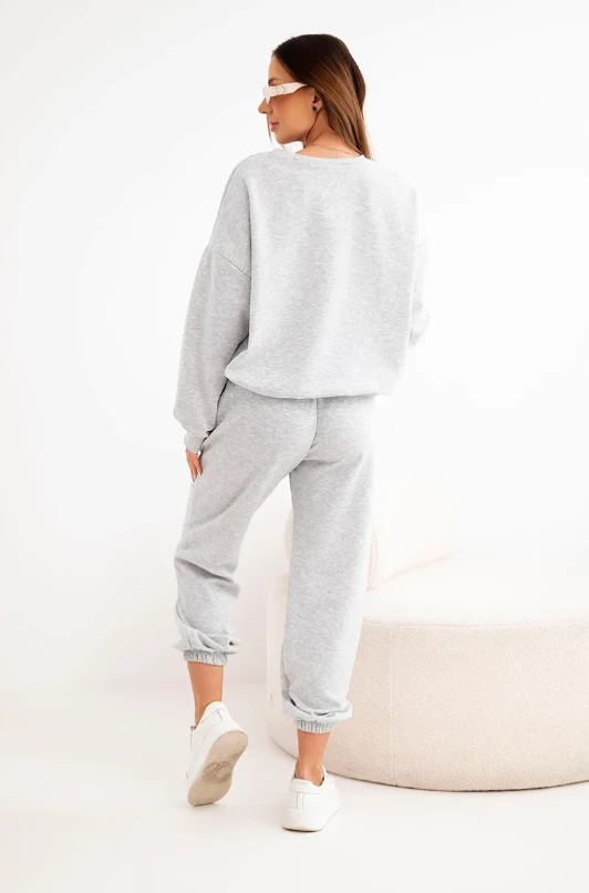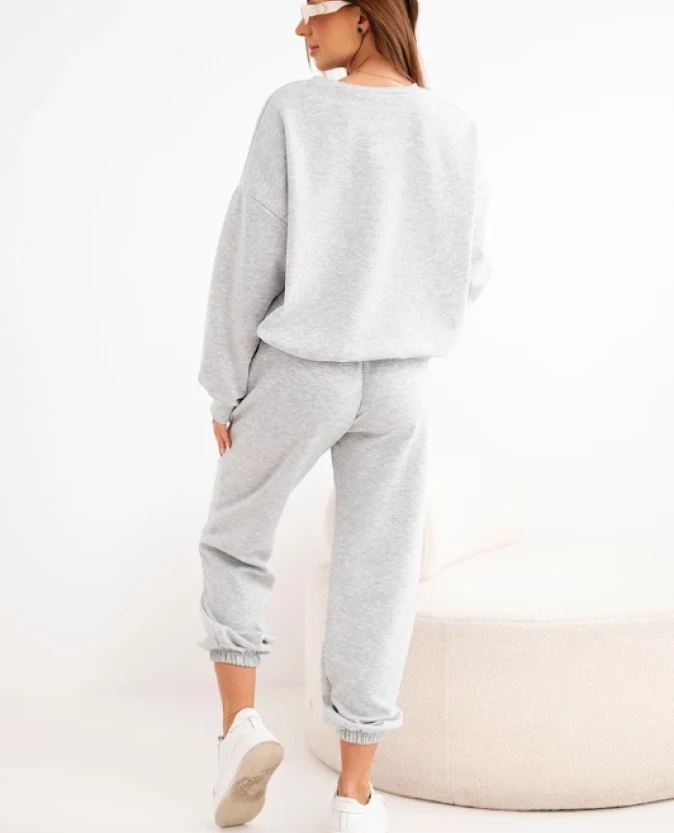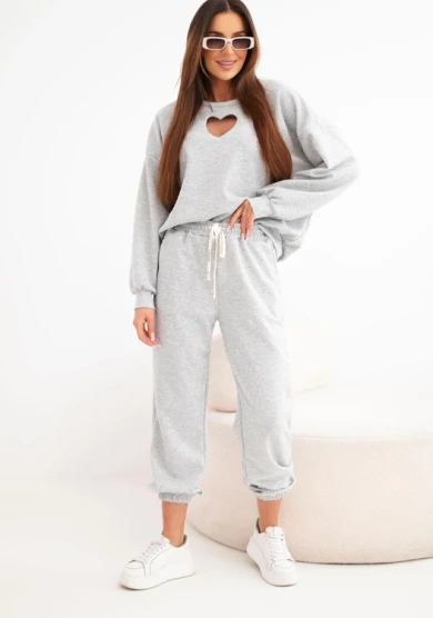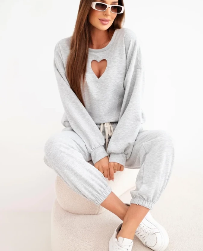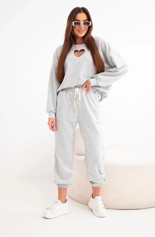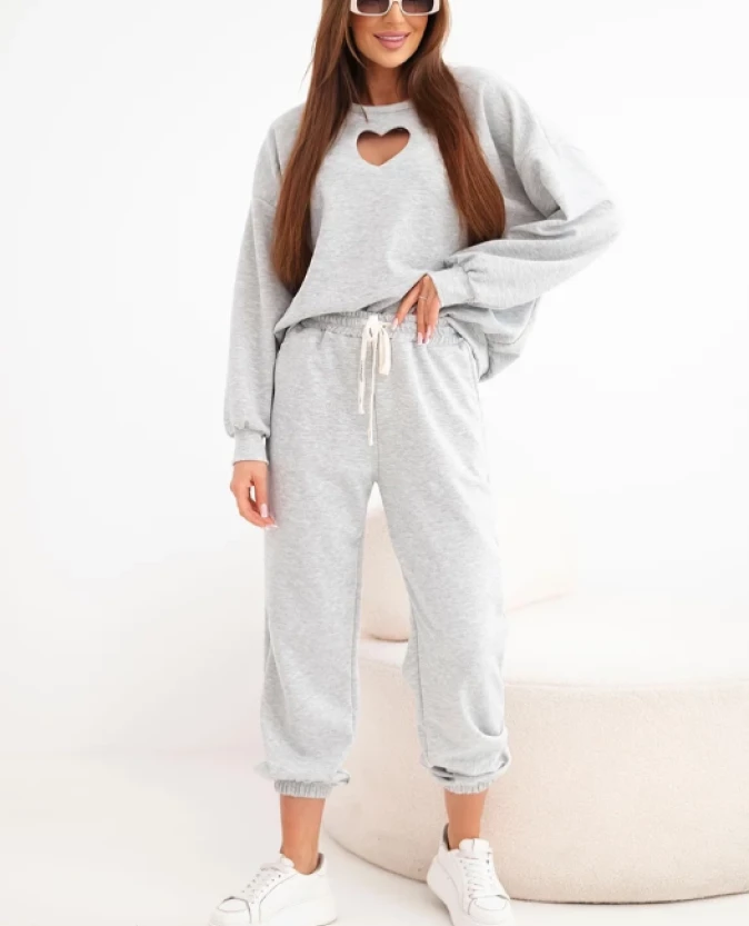 Elegancki w swojej prostocie komplet dresowy w odcieniu szarości to ponadczasowa propozycja na co dzień. Bluza z kobiecym wycięciem w kształcie serca przy dekolcie subtelnie przełamuje sportowy charakter zestawu, nadając mu delikatności i oryginalności.