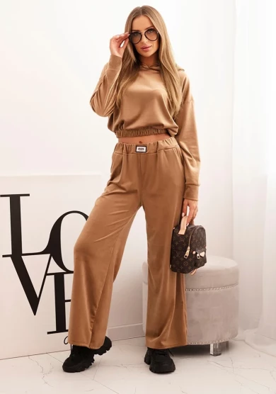 Spodnie z elastyczną talią, troczkiem oraz ściągaczami przy nogawkach zapewniają wygodę i doskonałe dopasowanie. Dzianina typu masełko zachwyca miękkością i elastycznością, sprawiając, że komplet staje się idealnym wyborem zarówno na spacer, jak i domowy relaks.