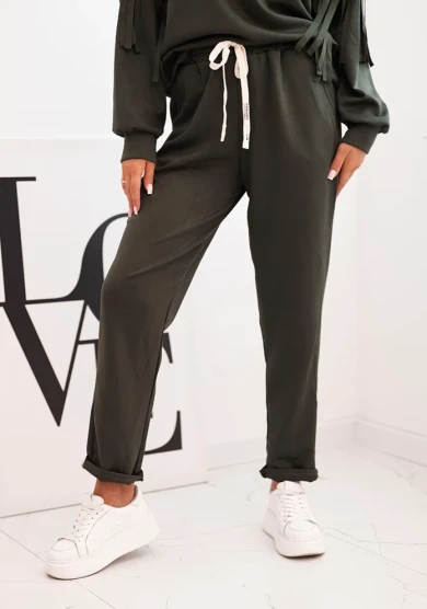Odcień khaki nadaje kompletowi nowoczesnego i stylowego charakteru. Frędzle na rękawach subtelnie przełamują klasyczną formę, tworząc modny, a zarazem elegancki efekt.