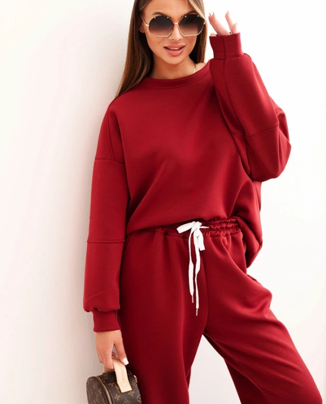 Głęboki bordowy odcień podkreśla kobiecy charakter i nadaje całości wyrazistej elegancji. Dwuczęściowy zestaw wykonany z miękkiej, elastycznej tkaniny pięknie układa się na sylwetce, zapewniając komfort oraz swobodę ruchów przez cały dzień.