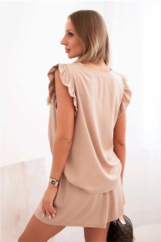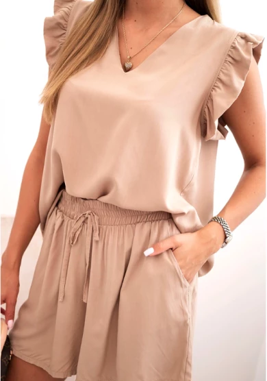 Komplet damski z wiskozy bluzka z falbankami i krótkie szorty Camelowy