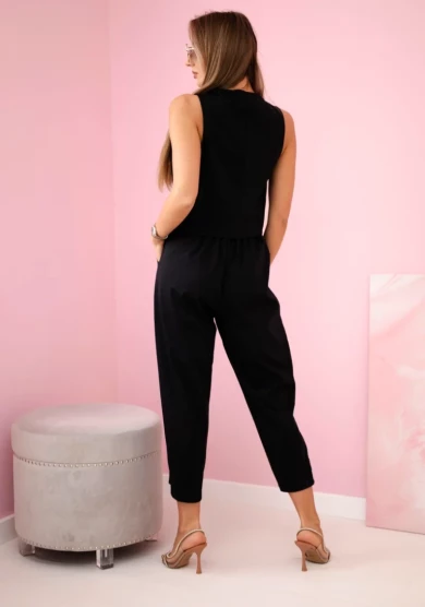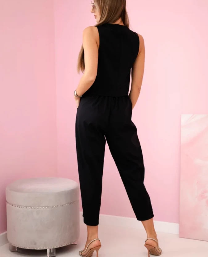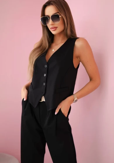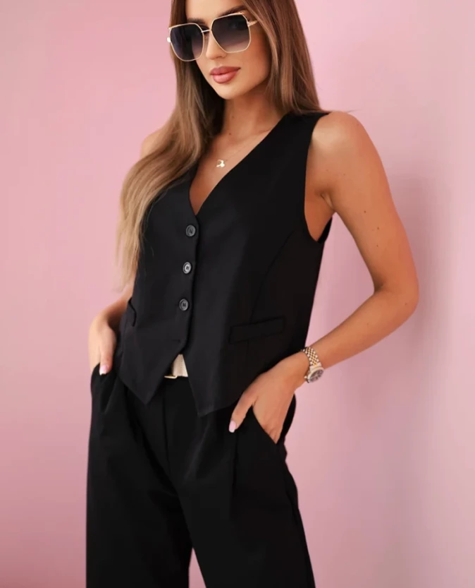 Czarny komplet to synonim klasy i uniwersalnej elegancji. Kamizelka pięknie podkreśla sylwetkę, a spodnie o klasycznym kroju gwarantują wygodę i stylowy wygląd. Idealny wybór zarówno do pracy, jak i na wyjątkowe okazje, gdzie liczy się szyk i komfort.