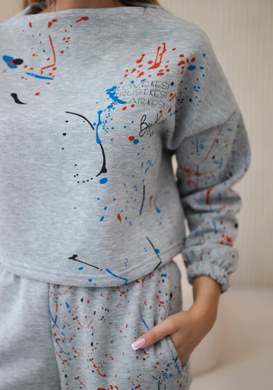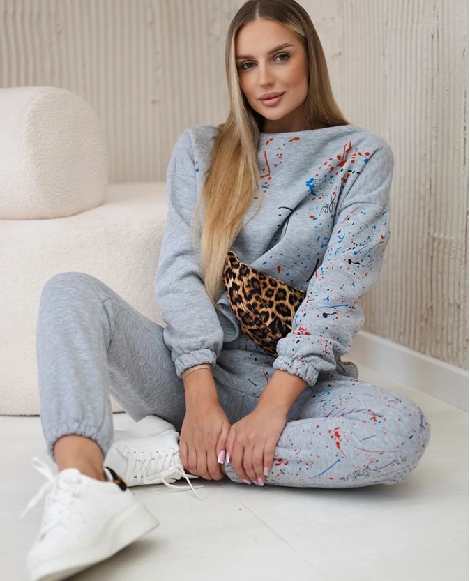 Szary komplet bluzy i spodni z kolorowym nadrukiem – ciepło i nowoczesny styl