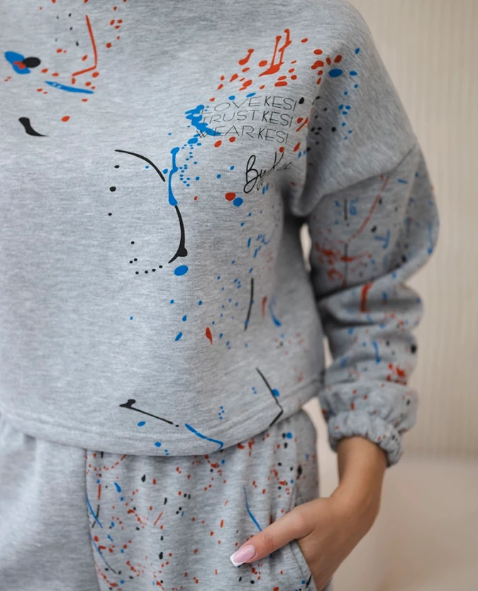 Szary komplet bluzy i spodni z kolorowym nadrukiem łączy komfort z nowoczesnym, casualowym stylem. Ocieplany materiał zapewnia ciepło i wygodę przez cały dzień, a uniwersalny fason dopasuje się do osób noszących S, M lub L. Doskonały do codziennych, stylowych zestawów – idealny na spacer, zakupy czy spotkania w luźnym wydaniu.