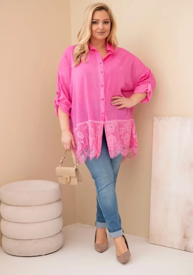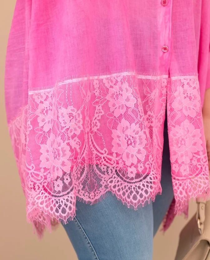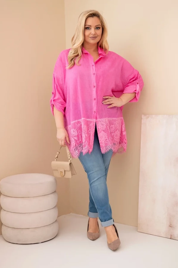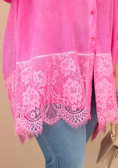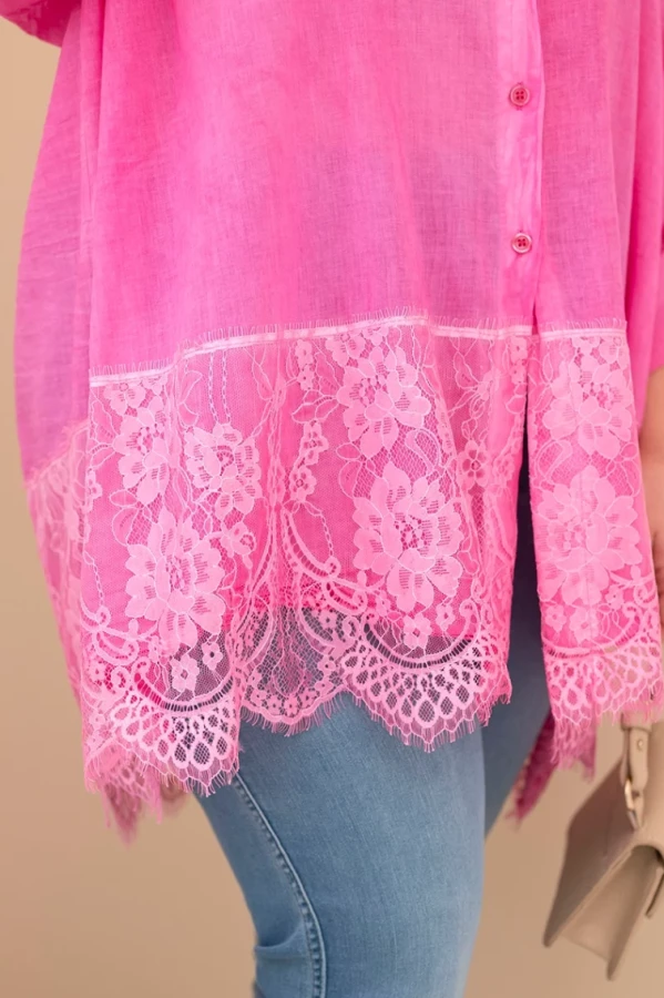 Koszula przecierana z koronkowym wykończeniem - Różowa