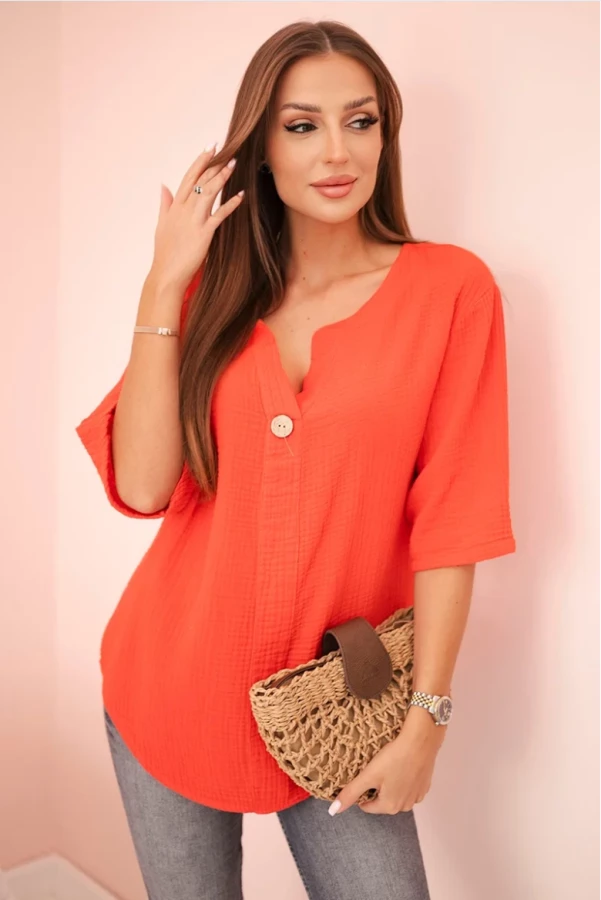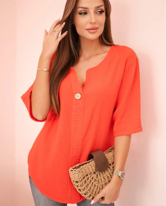 Luźny krój gwarantuje swobodę ruchów, a subtelny guzik przy dekolcie podkreśla jej kobiecy charakter. Idealna zarówno do codziennych zestawów, jak i wakacyjnych stylizacji w stylu boho.