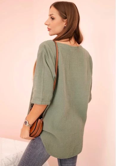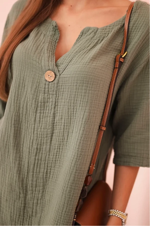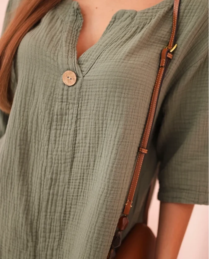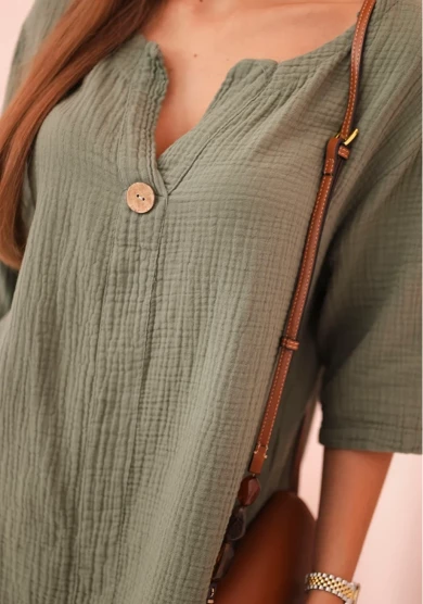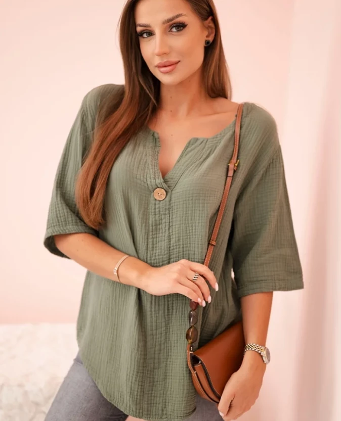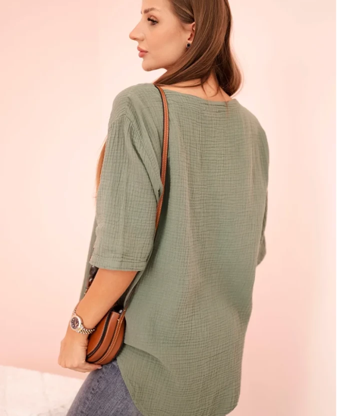 Khaki muślinowa koszula to doskonałe połączenie naturalnego stylu i nowoczesnej prostoty. Ziemisty odcień świetnie komponuje się z bielą, beżem czy denimem, tworząc spójne i modne zestawy.