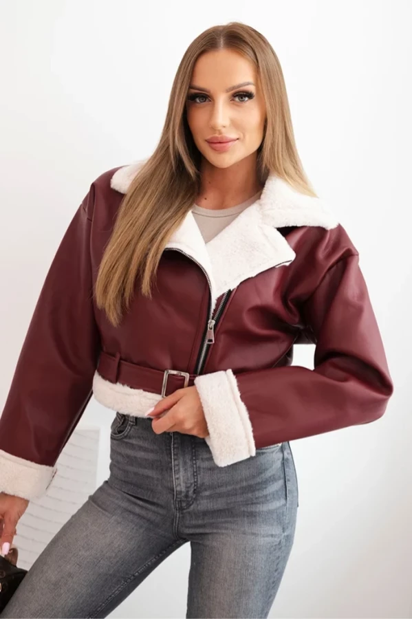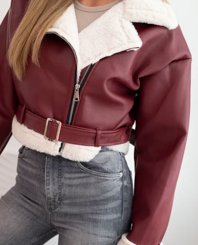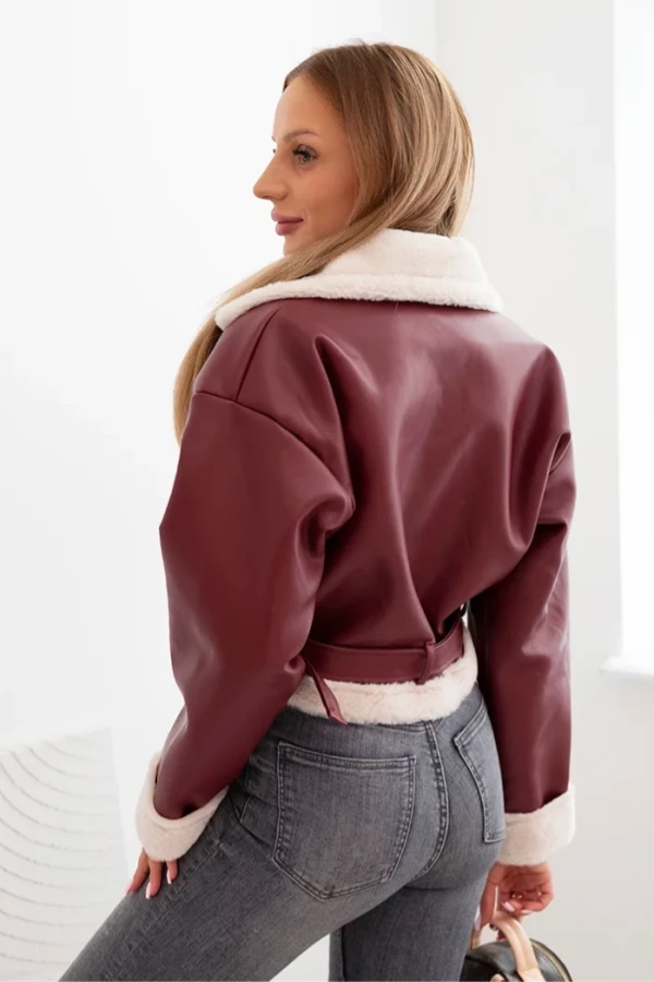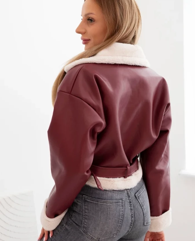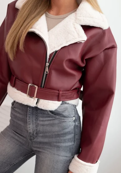Kurtka damska pilotka z ekoskóry ocieplana z kożuchem i paskiem Bordowa