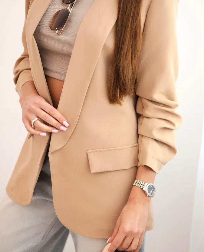 Camelowy odcień podkreśla ponadczasowy styl i subtelną elegancję. Marynarka bez zapięcia z klasycznymi klapami to doskonały wybór dla kobiet ceniących naturalne barwy i stylowe rozwiązania.