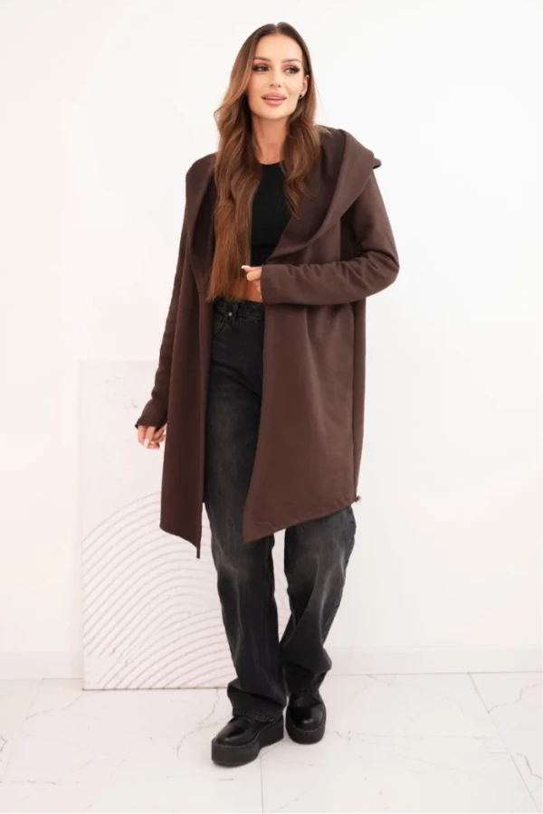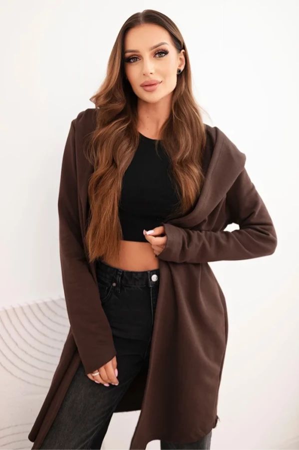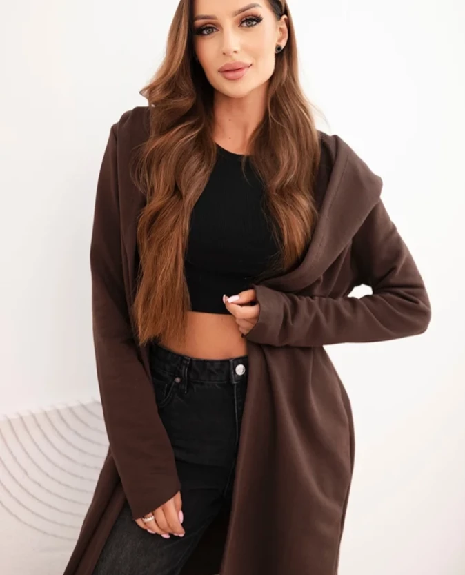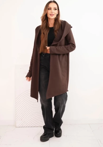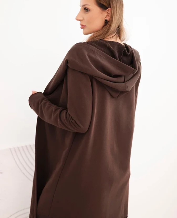 Narzutka damska z bawełny z kapturem i wydłużonym przodem Brązowa