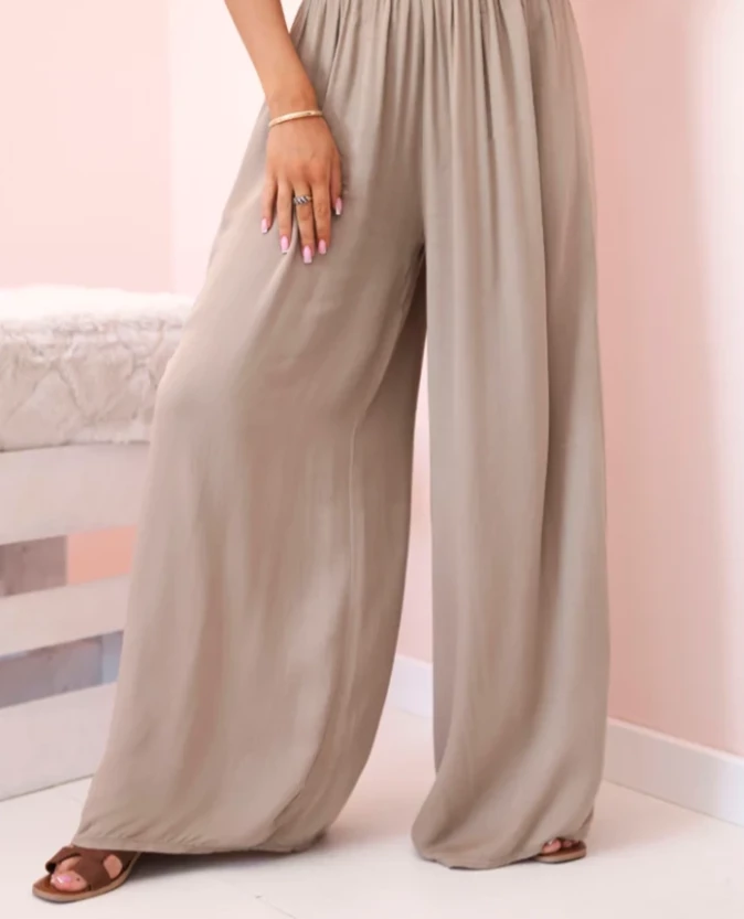 Szerokie nogawki tworzą efekt delikatnego ruchu i nadają sylwetce lekkości, natomiast elastyczna gumka w pasie zapewnia wygodę oraz idealne dopasowanie. To model, który z łatwością wystylizujesz zarówno na co dzień, jak i na wyjątkowe okazje.