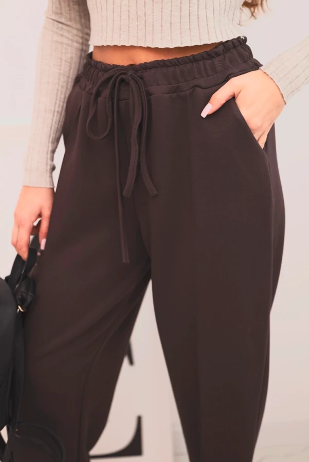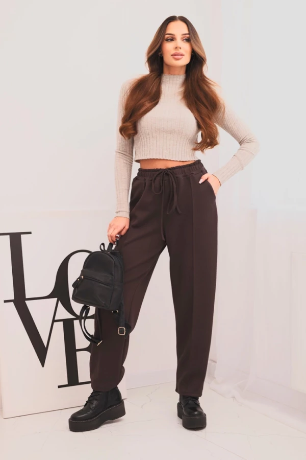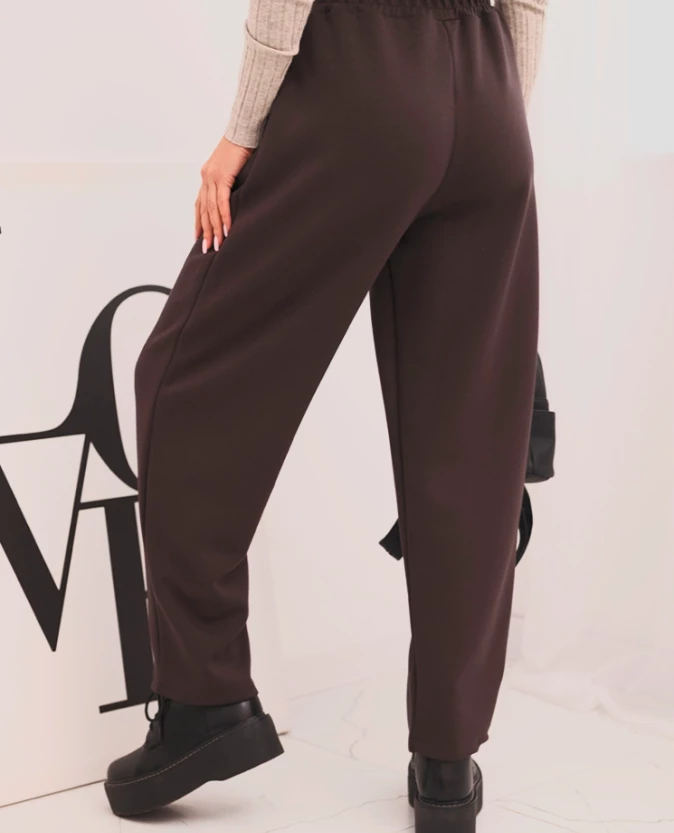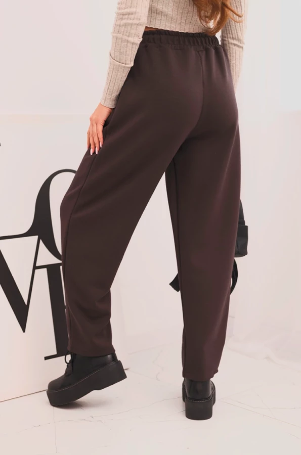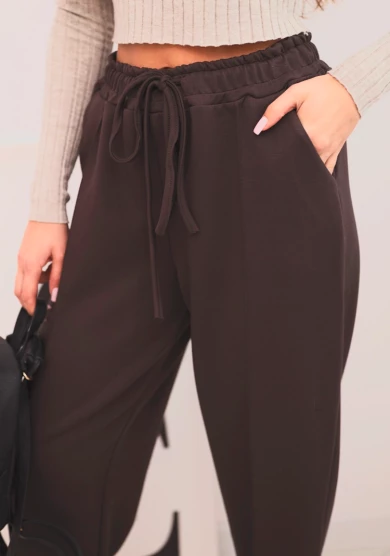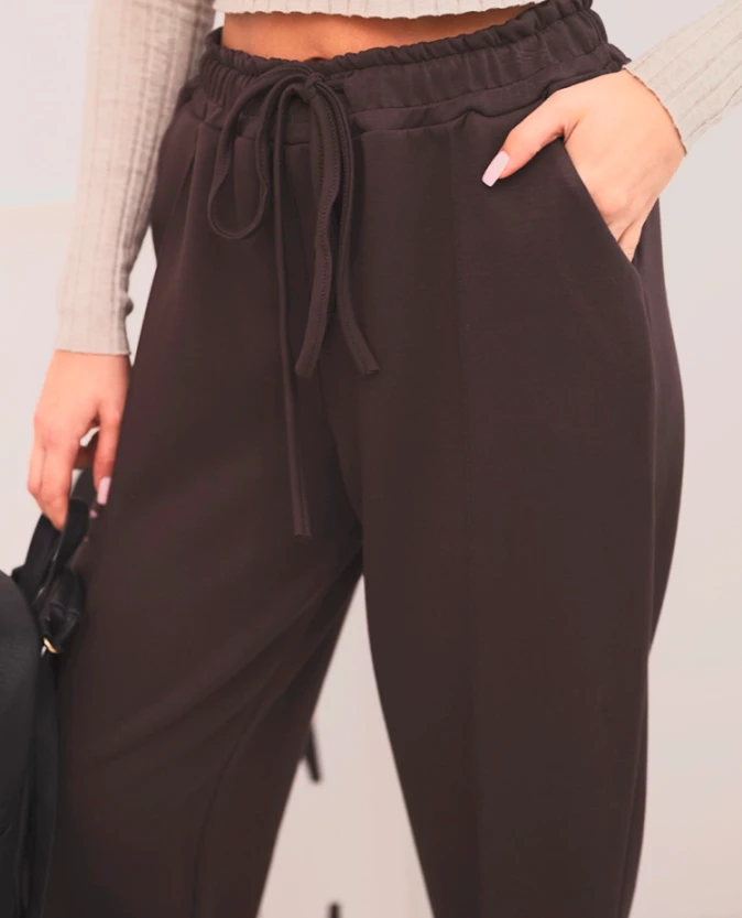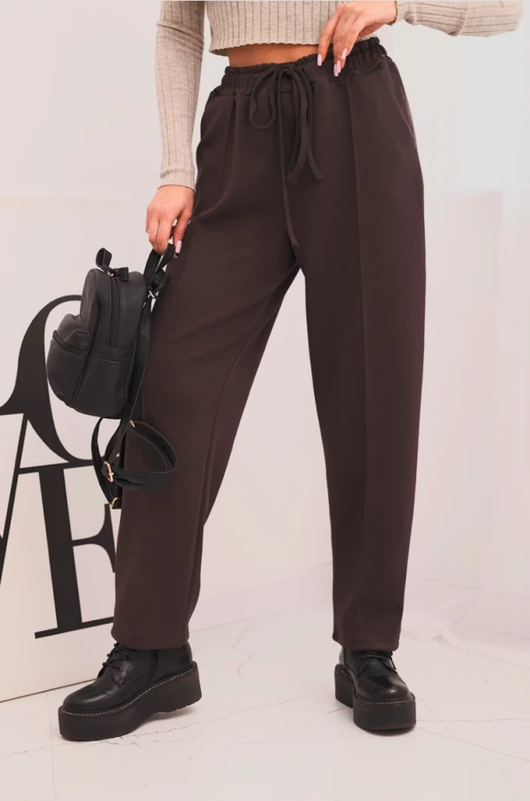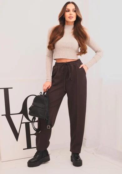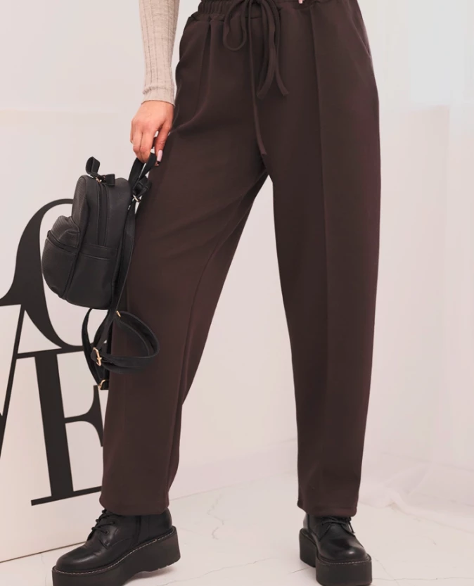 Spodnie damskie z wysokim stanem i wiązaniem w pasie Brązowe