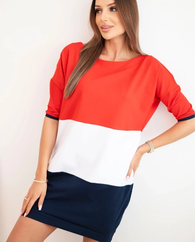 Kontrastowe przejścia kolorystyczne w trzech poziomach nadają całości dynamicznego charakteru i optycznie modelują sylwetkę. Wysokiej jakości, elastyczny materiał jest miękki i przewiewny, dzięki czemu sukienka doskonale sprawdzi się podczas spacerów, zakupów czy spotkań z przyjaciółmi. Wystarczy dobrać trampki lub espadryle, aby stworzyć stylowy, casualowy look.
